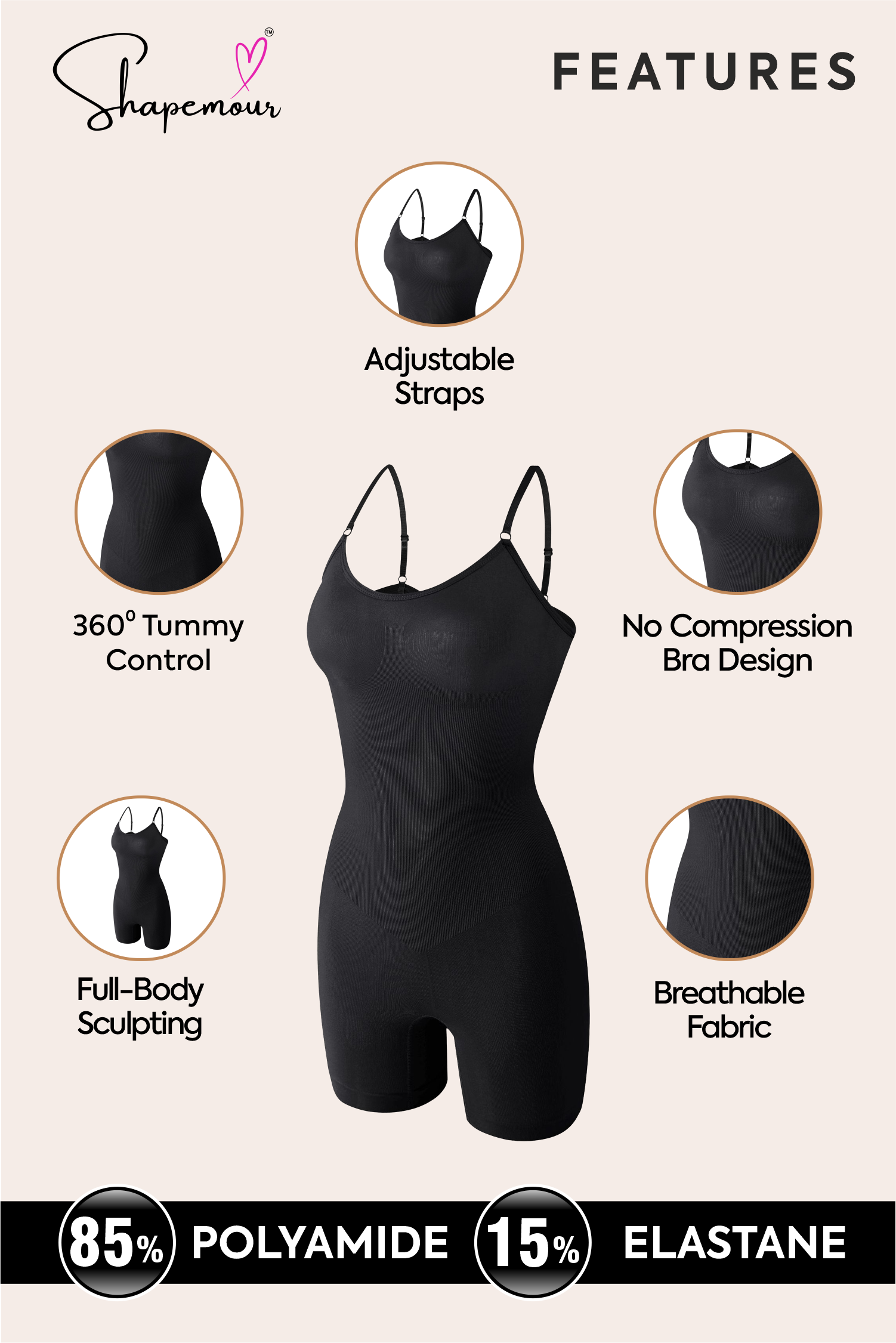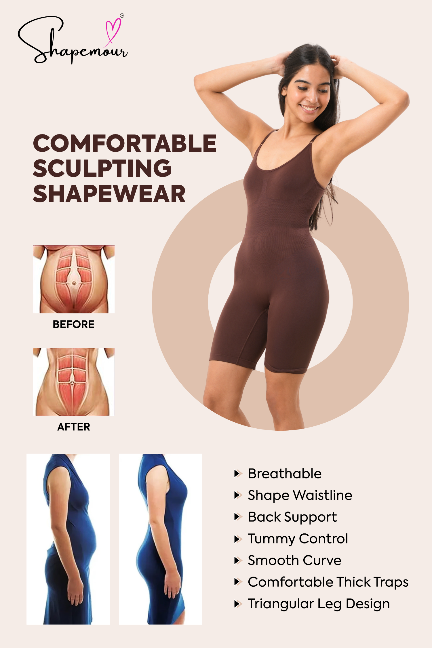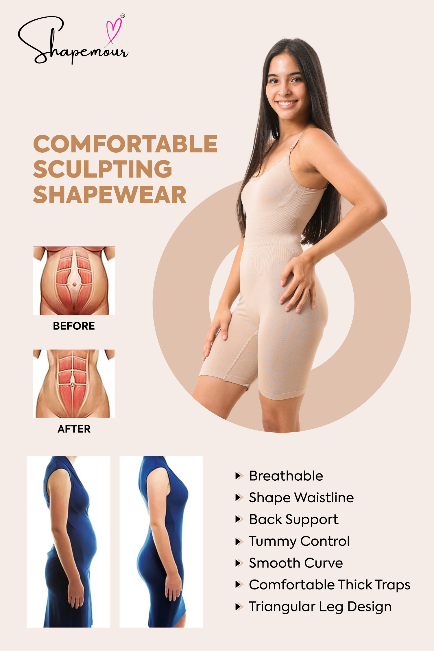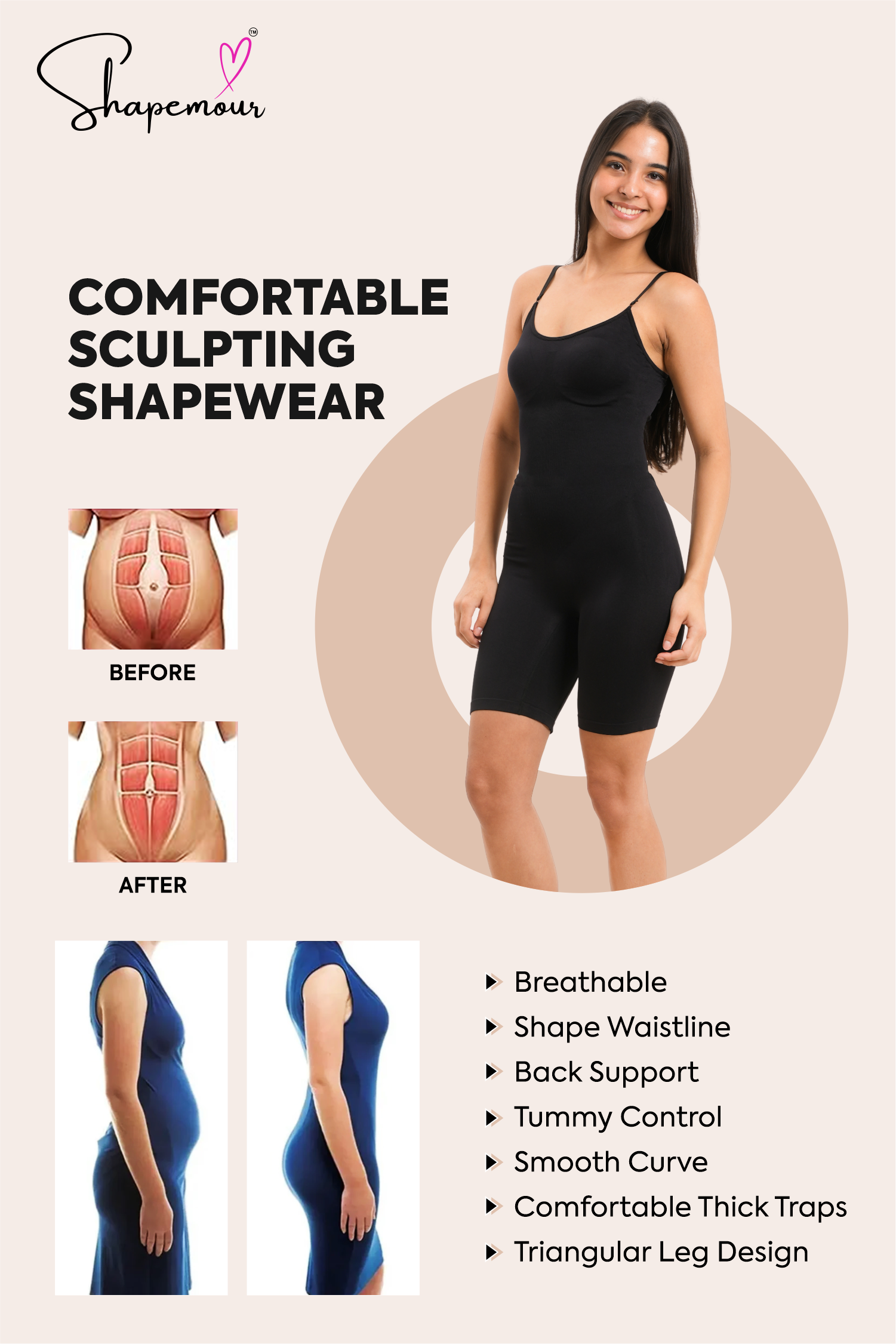 SHAPEMOUR shapewear is designed with a second-skin fit that combines comfort and effective compression. It’s crafted from breathable, stretchable fabric that moves with your body while providing all-day support. Unlike many shapewear products, it stays in place without rolling or bunching.